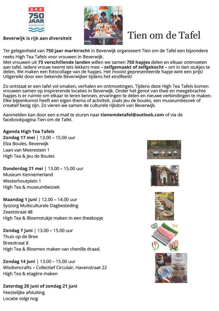 Ter gelegenheid van 750 jaar marktrecht in Beverwijk organiseert Tien om de Tafel een bijzondere reeks High Tea Tafels voor vrouwen in Beverwijk.